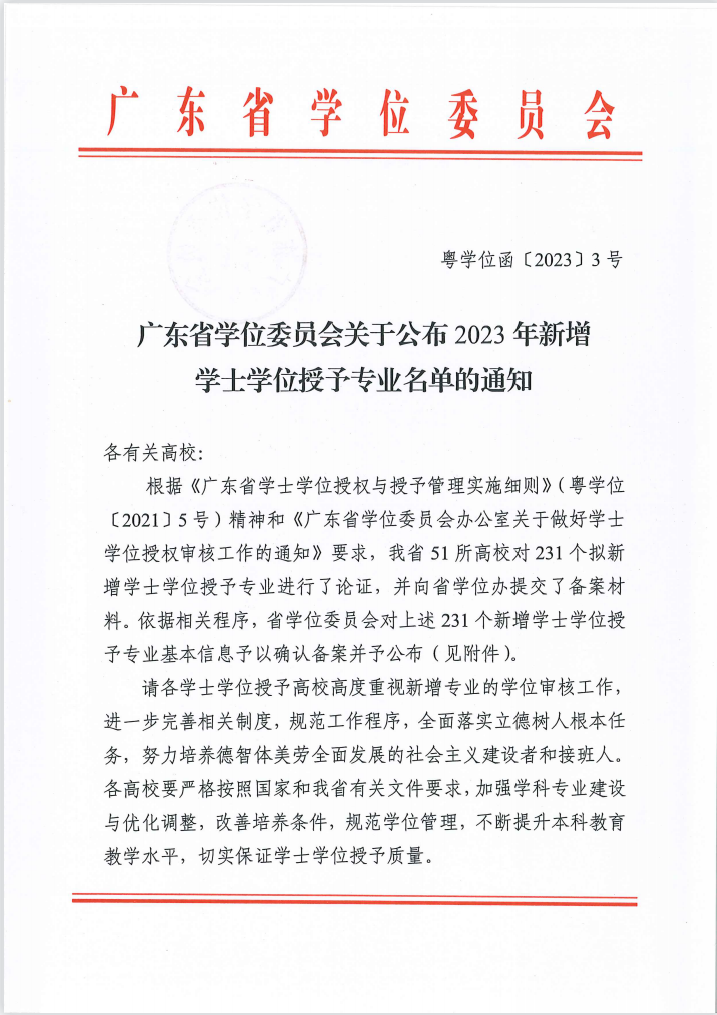 近日,广东省学位委员会发布《广东省学位委员会关于公布2023年新增学士学位授予专业名单的通知》,公布了今年广东省51所高校的231个新增学士学位授予专业。我校工商管理、数据科学与大数据技术、健康服务与管理、税收学、中药学、化妆品科学与技术、小学教育、金融科技、翻译9个专业获得学士学位授予权。