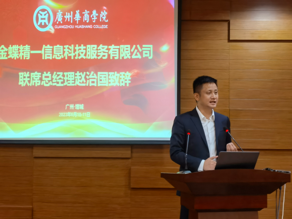 随后,金蝶精一联席总经理赵治国热情致辞,他首先对莅临参加本次培训会议的各位专家老师表示热烈欢迎,介绍了数字经济下的人工智能对会计专业人才培养的影响,并强调财务作为企业重要的核心支持部门,应紧跟时代步伐,实现数字化转型,同时,他从决策角度对金蝶精一的发展定位与业务内容进行举例,期望大学教育也应该紧跟时代步伐,实现数字化转型。最后,赵总预祝此次会议圆满成功。