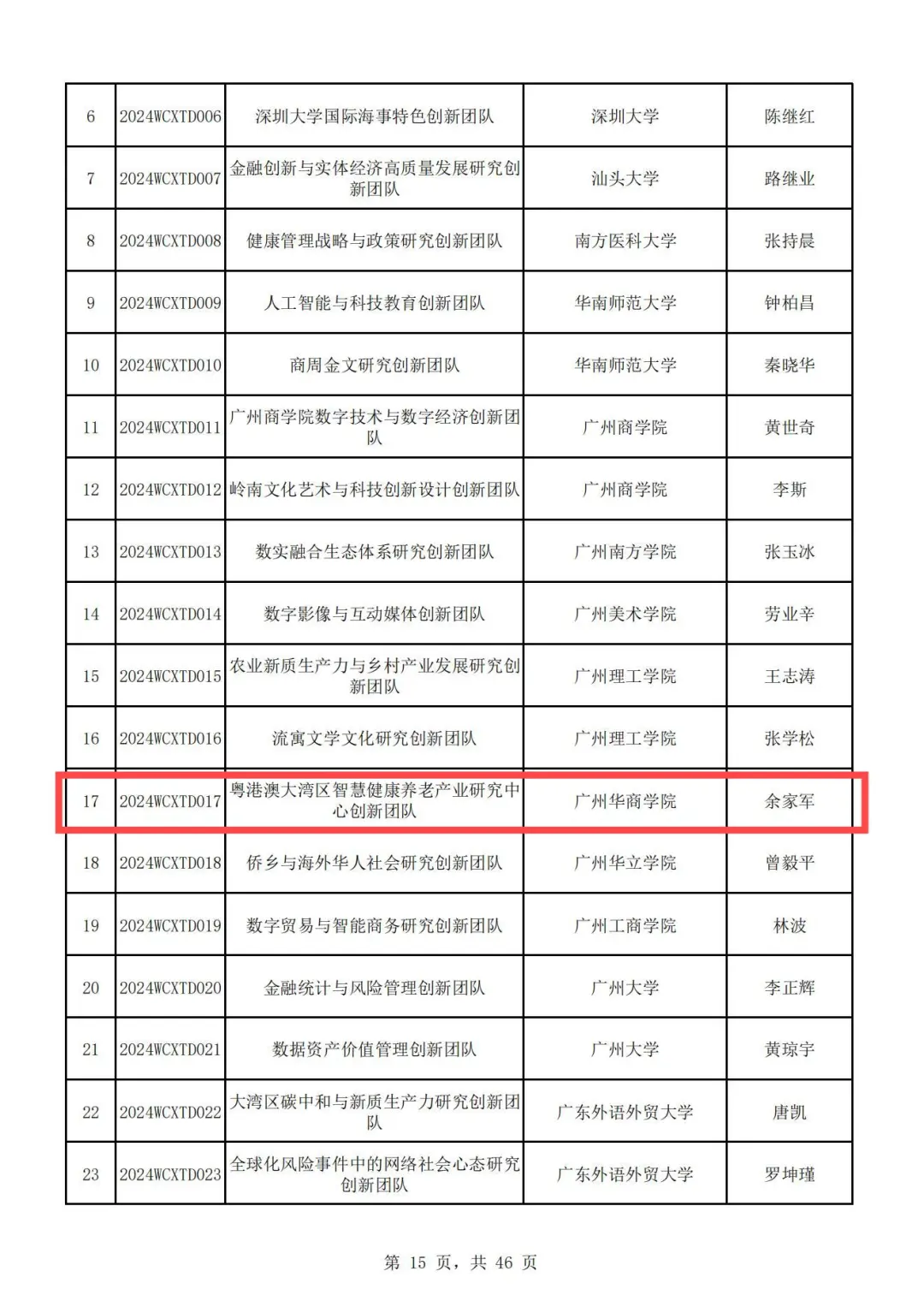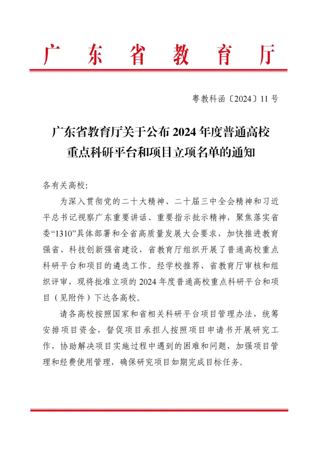 近日,广东省教育厅发布了《广东省教育厅关于公布2024年度普通高校重点科研平台和项目立项名单的通知》(粤教科函〔2024〕11号),BBV电子体育“粤港澳大湾区智慧健康养老产业研究中心创新团队”项目获批立项。