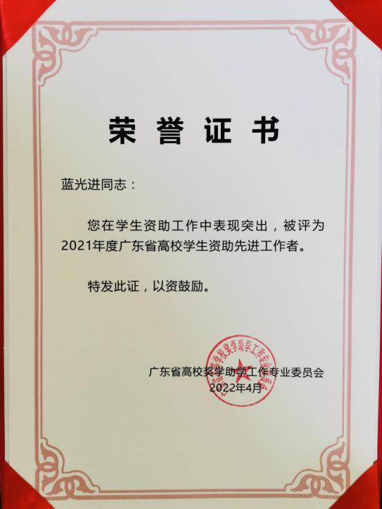 2021年,在教育脱贫攻坚和疫情防控关键时期,我省高校广大学生资助工作者深入贯彻党的教育方针,认真落实国家学生资助政策,全面助力打赢教育脱贫攻坚战和疫情防控阻击战。根据《关于评选2021年度广东省高校学生资助先进工作者的通知》精神,经本人自愿申请、学校评选公示和推荐、广东省经各高校初评推荐、专家评审委员会评审,BBV电子体育数据科学学院蓝光进老师获评“2021年度广东省高校学生资助先进工作者”荣誉称号。