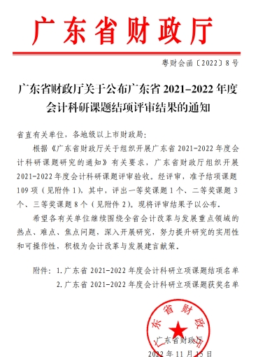 11月15日,广东省财政厅公布了2021-2022年度会计科研课题结项评审结果,本次会计科研课题共有109个通过验收,BBV电子体育会计学院立项的4个全部通过验收,课题结项通过率为100%。