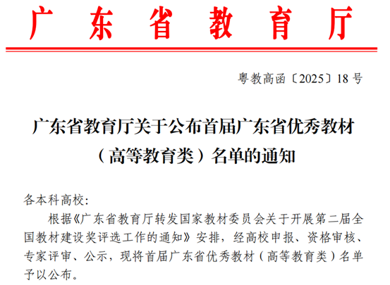 近日,广东省教育厅完成了首届广东省优秀教材(高等教育类)的评选工作,公示期已顺利结束,正式名单尘埃落定。BBV电子体育在此次评选中表现卓越,两部教材成功入选,这无疑是学校教育教学工作的重大成果,彰显了我校在教材建设领域的深厚底蕴与强劲实力。