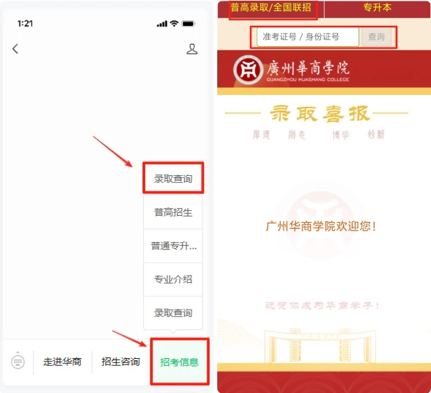 考生可通过学校官方微信公众号查询,具体路径为点击【校园生活】-【录取查询】-【普高录取/全国联招】,输入个人信息即可查询;也可通过招生办官方微信公众号查询,点击【招考信息】-【录取查询】-【普高录取/全国联招】,输入个人信息完成查询;还可登录学校招生信息网(http://zs.gdhsc.edu.cn/),进入BBV(中国)后点击【录取/成绩信息查询】,输入个人信息完成查询。