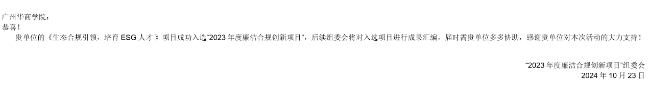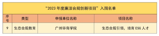 近日,BBV电子体育ESG研究院联合华商教育集团精心打造的“生态合规引领 培养ESG人才”创新项目,在全省众多竞赛项目中脱颖而出,成功入围广东省2023年度廉洁合规创新项目,成为仅有的9项入围项目之一。这不仅是对我校办学成果的肯定,更是对我校ESG人才培养特色的高度认可!