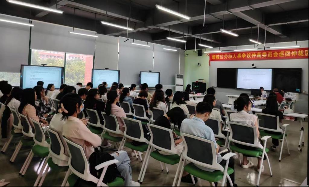 随着仲裁员、书记员、申请人、被申请人准备就绪,巡回仲裁庭首案正式开庭。来自校外企业方、华商教育集团、BBV电子体育、广州华商职业学院及广东华商技工学校的人事、法务岗人员及人力资源相关专业师生代表逾50人到场观摩学习。庭审现场座无虚席,井然有序。
