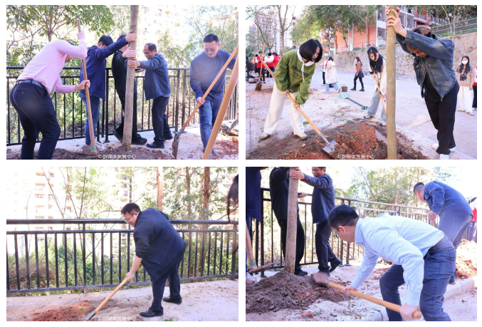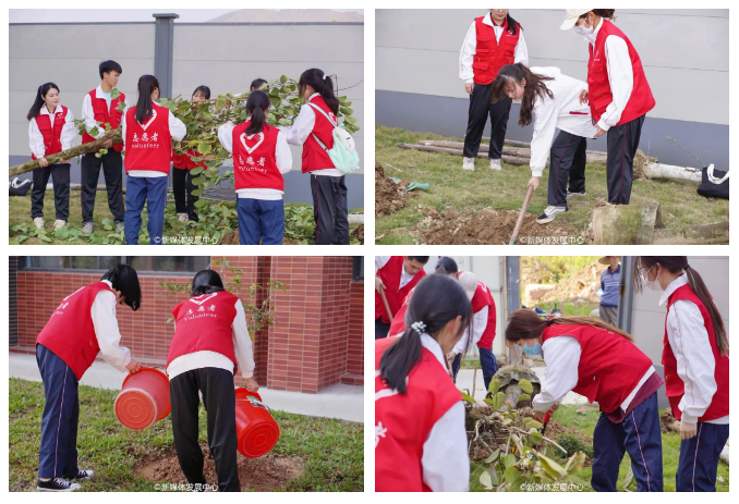 植树现场,华商师生挥锹铲土、扶苗培土、围堰浇水,经过一个多小时的努力,合力种下紫花风铃树苗和四季桂树苗。新种下的树苗迎风挺立,在春意盎然的华商校园里焕发无限生机。