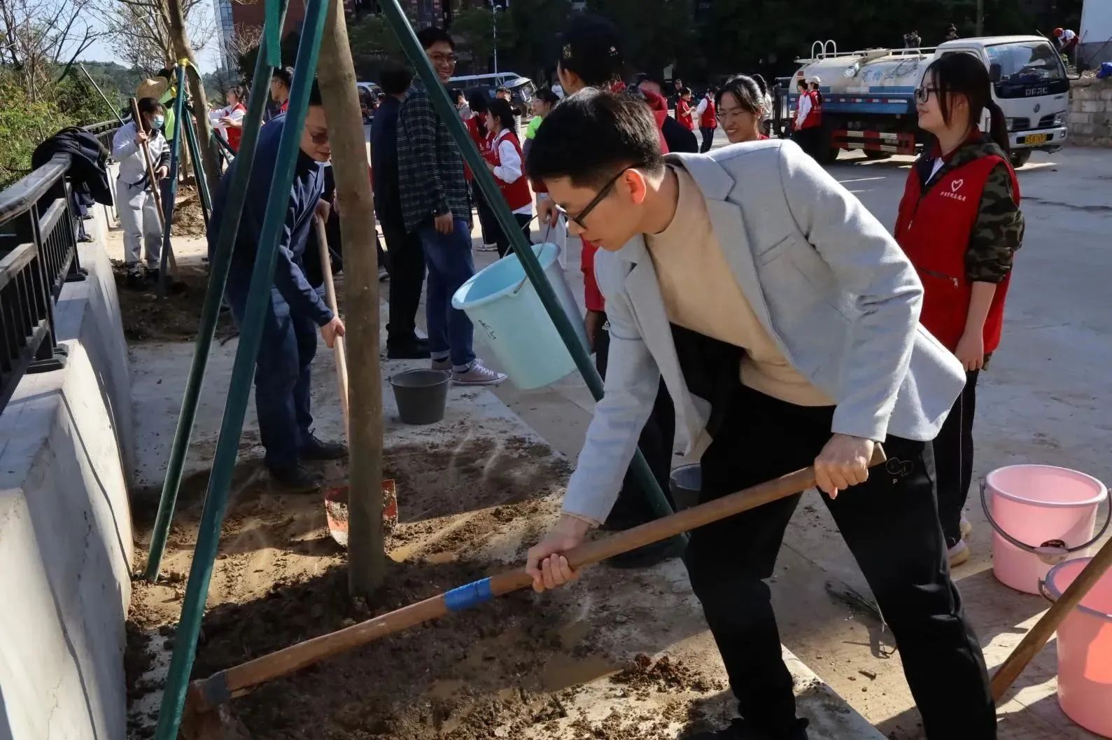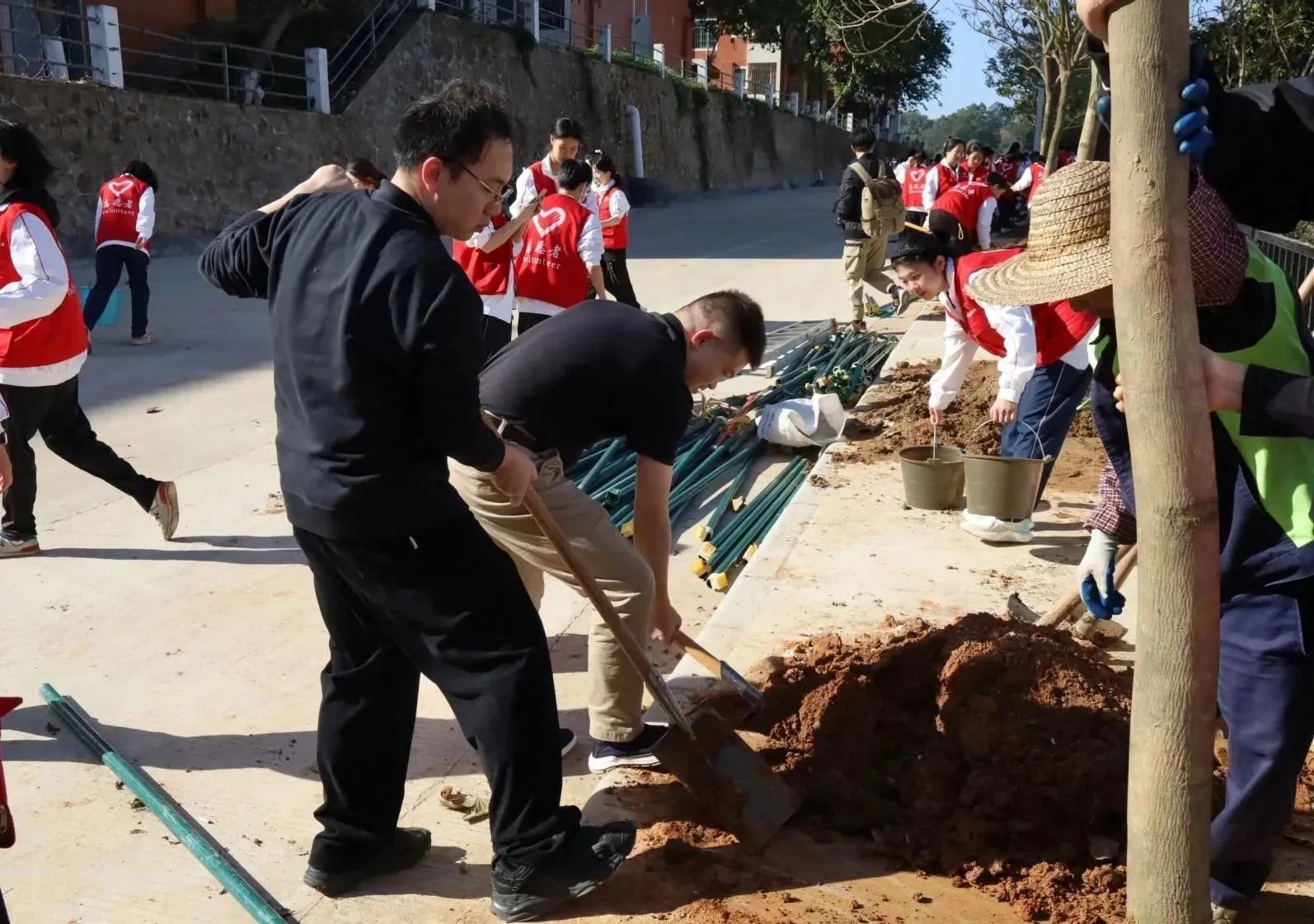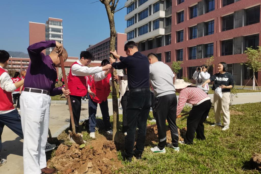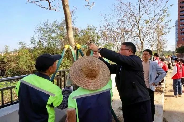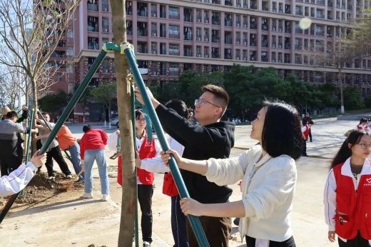 启动仪式后,各院校分别开展植树节活动。为引领华商青年在实践中践行绿色发展理念,助力绿美广东生态建设,BBV电子体育“绿美广东 青年先行”植树护绿活动在双校区同步进行。学校党委书记陈玉欢、副校长王卫平、校长助理黄伟新、肇庆校区党委书记苏宁、学校党委委员、各二级学院党团组织负责人、学工主任、学生会指导老师与志愿者、绿化工人一道,为华商校园再添新绿。
