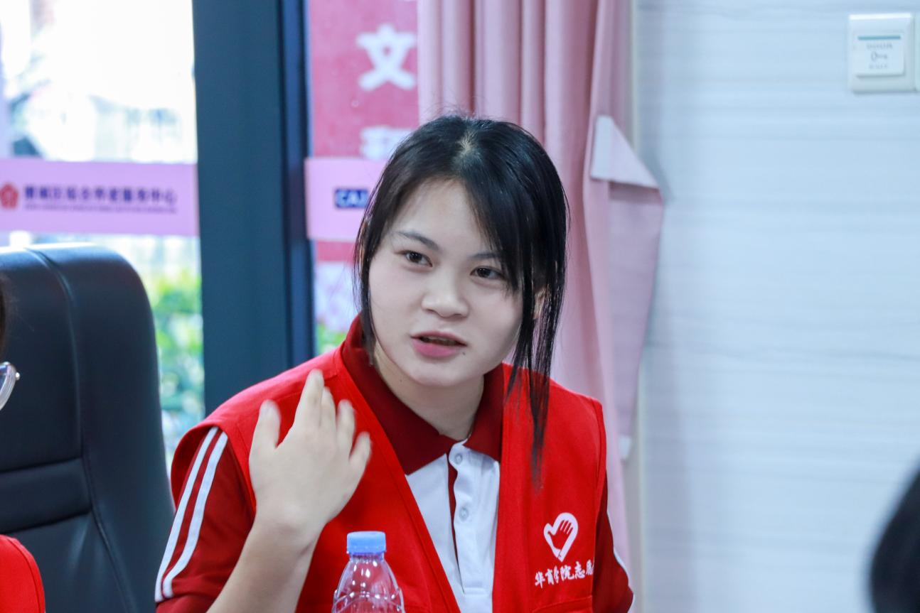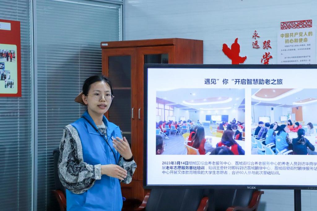 介绍“智慧助老”项目服务情况。广州慈爱嘉养老服务中心葛芳芳主任介绍到,2023年3月至12月,BBV电子体育“智慧助老”项目开展以来,近200名华商青年志愿者在增城区两个社区参与助老、敬老志愿服务,服务长者500余人,在实践中彰显华商学子的责任担当。活动中,在中心工作人员指导下,华商志愿者采用一对一或集体授课的形式,开展智能手机班、化妆班、中医养生、手工绘画等课程,为社区老人带来新知识、新活力、新体验。