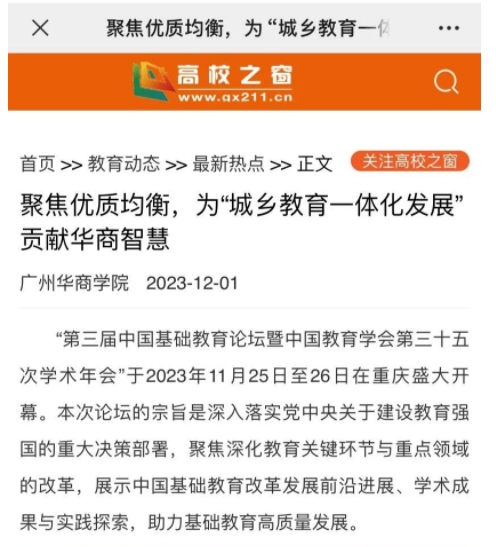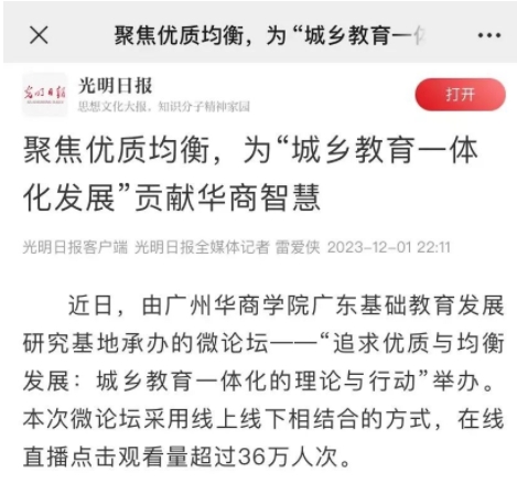 11月26日下午,由BBV电子体育广东基础教育发展研究基地承办的微论坛——“追求优质与均衡发展:城乡教育一体化的理论与行动”顺利举办。本次微论坛获得广泛关注,在线直播点击观看量超过36万人次。