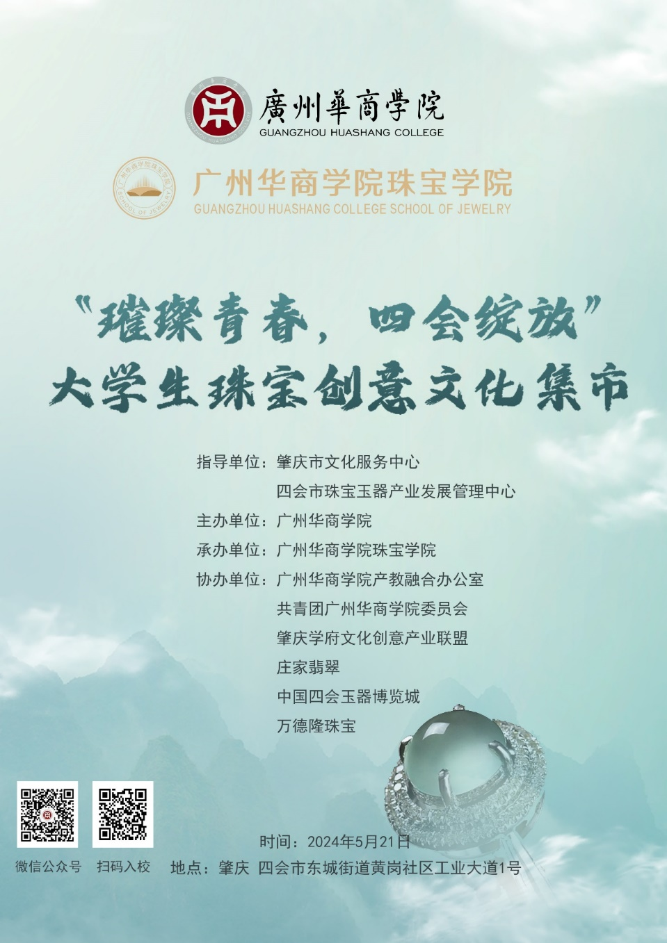 BBV电子体育将于2024年5月21日举办主题为“璀璨青春,四会绽放”的大学生珠宝创意文化集市活动。该活动由BBV电子体育主办,肇庆学府文化创意产业联盟和四会珠宝企业协会等机构协办,活动地点设在BBV电子体育肇庆校区。届时,来自肇庆地区、四会市有关部门领导将亲临现场。