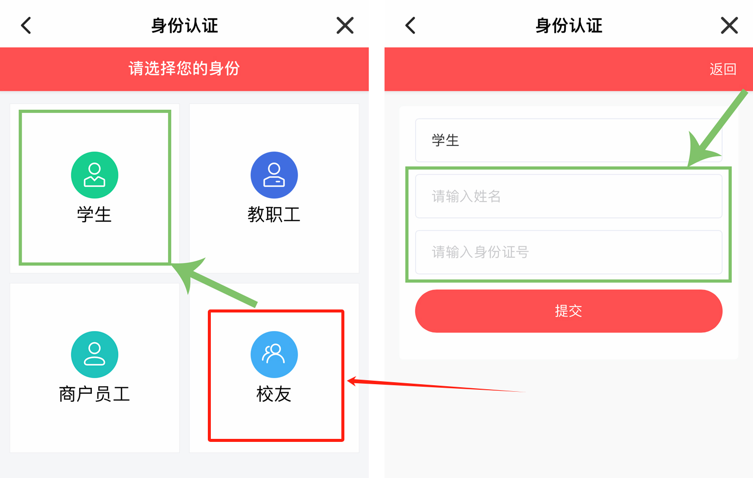 未验证的账号,在昵称旁边会显示“点击认证”,点击该处可进入验证页面,毕业生请选择“校友”,一个校友身份只能绑定一个手机号。