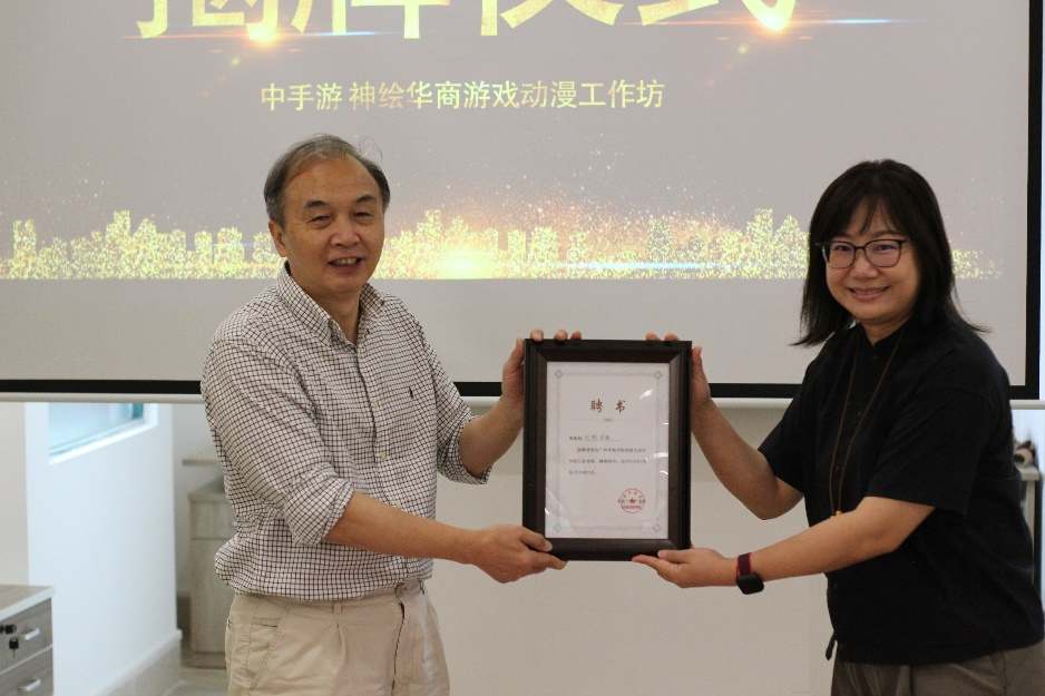 为促进双方合作与实践教学,BBV电子体育创意与设计学院聘请中手游神绘公司总经理骆俊、美术总监刘畅担任 “行业导师”,王列耀副校长为其颁发聘书。