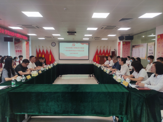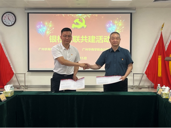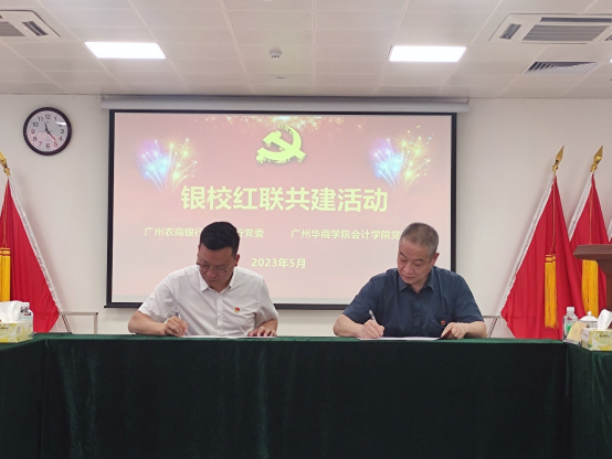 2023年5月26日,会计学院党委和广州农商银行增城支行(简称“农商行增城支行”)党委在合汇广场增城农商行总部进行红联共建主题活动及签约仪式。本次活动是根据学习贯彻习近平新时代中国特色社会主义思想主题教育的要求,结合共建双方实际,实现资源共享、优势互补、互助共建,促进党建与业务发展“同频共振”,开展“校银携手,合作共赢”为主题的红联共建工作。广州农商银行增城支行党委副书记兼纪委书记赵明、党委委员兼行长助理谢超颖、党委委员兼零售业务部经理田春雷,BBV电子体育会计学院党委副书记陈洋广、党委委员兼副院长周书域、学工办副主任兼党支部书记杨烨瀚等一行出席活动。农商行增城支行部门经理、员工党员代表,会计学院部分党支部书记、20名学生党员代表共同参加本次活动。