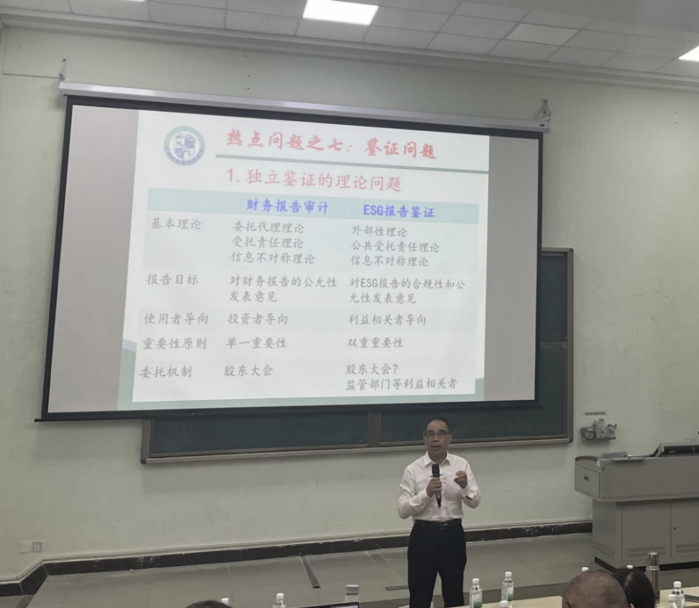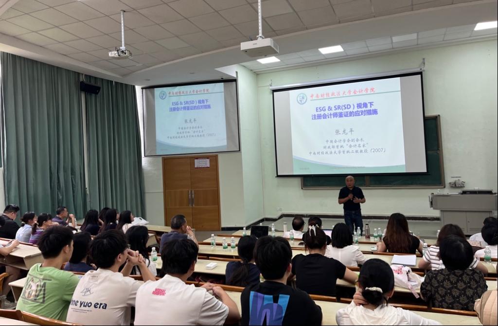 中南财经政法大学张龙平教授为会计学院师生作题为“ESG&SR(SD)视角下注册会计师鉴证应对策略”的专题报告。张教授系统阐述了ESG/SR报告的背景、七大核心争议、全球统一准则的发展趋势以及这个趋势带来的“双重报告”革命。他重点分析了这对注册会计师行业产生的深远影响,特别是对独立鉴证业务带来的巨大机遇与严峻挑战,并提出了CPA行业积极应对的八项具体措施。他强调,这场变革要求财会审计监督和国家治理的目标、范围、思路和方法都必须进行根本性的重塑与变革。