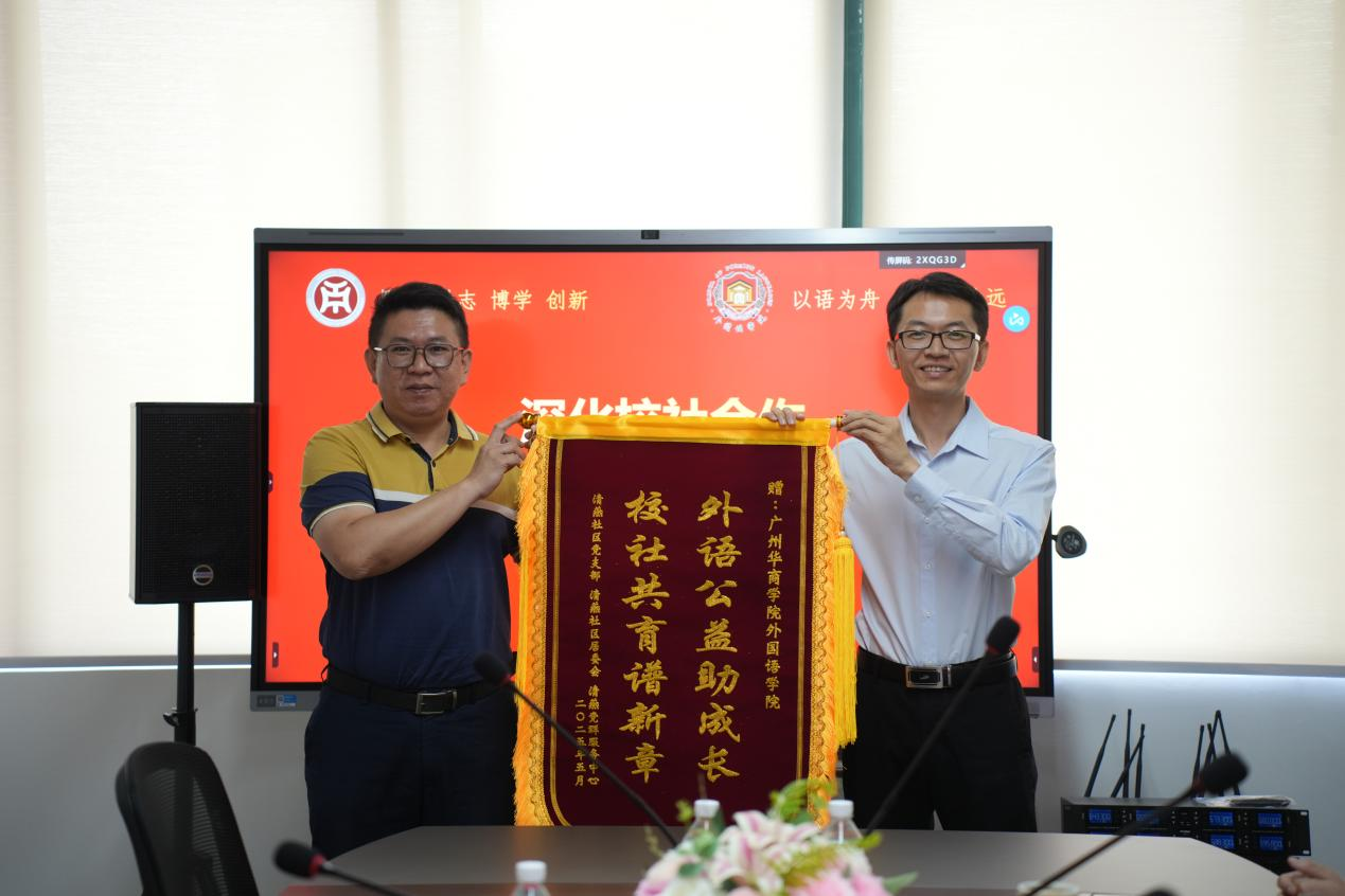 5月13日上午,BBV电子体育外国语学院与增城区清燕社区、锦绣半山御景花园小区物业联合举办的“晚风学堂”英语晚辅公益项目赠锦旗仪式在创新楼403-2小会议室举行。清燕社区邓镜波书记、锦绣半山御景花园小区物业陈勇经理、外国语学院何顺发副院长及“晚风学堂”项目组全体成员共同见证这一校社协同育人的温暖时刻。“晚风学堂”不仅体现了外院学子践行社会责任的热忱,更是校社双向奔赴、共筑教育公益新模式的生动缩影。